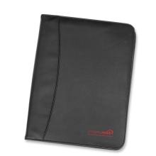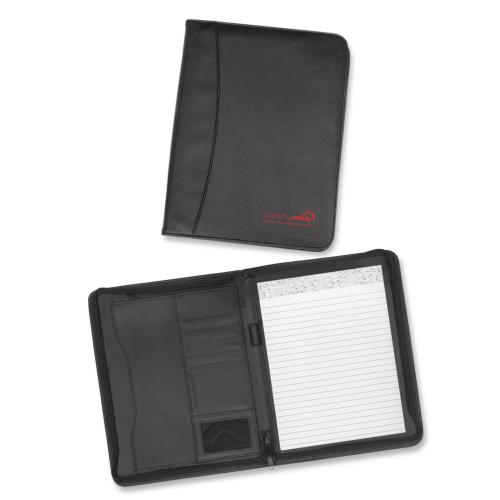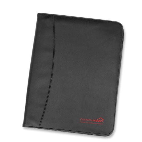 Large PU portfolio with a secure zippered closure, a large internal document folder, a lined A4 pad, several pockets for business cards and a pen loop. It laser engraves to a matt brown finish.