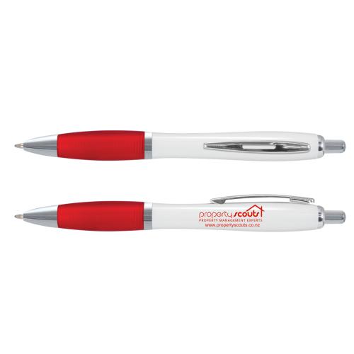 Custom printed Property Scouts logo retractable plastic ballpoint pen with a white barrel, a translucent soft-touch grip and shiny chrome trim.